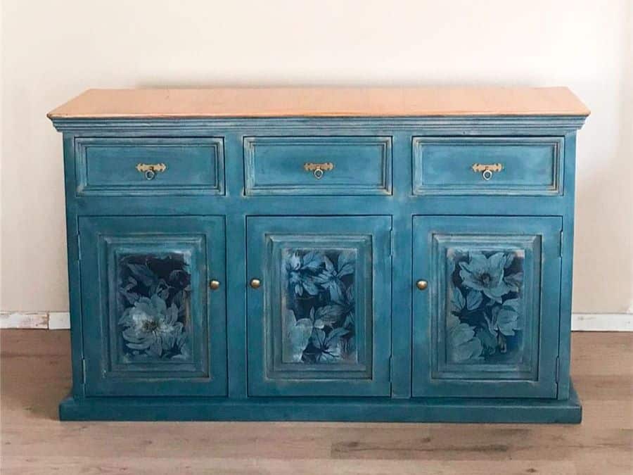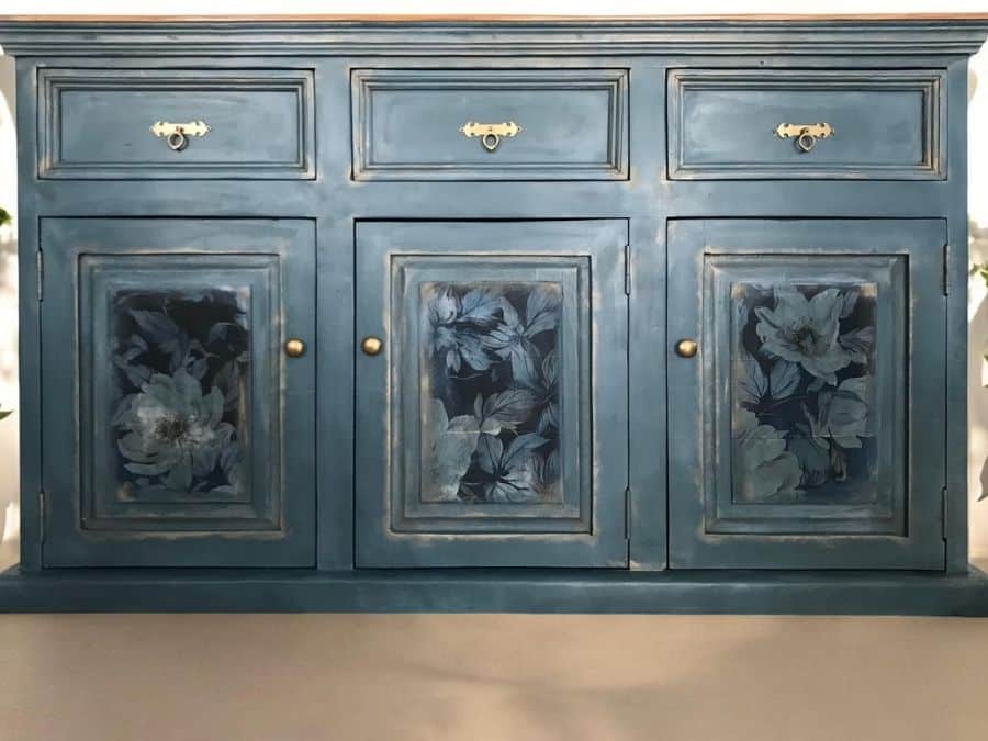 El aparador ha sido restaurado y pintado a mano en un atractivo color azul profundo, trabajado con técnicas de pátina y envejecido que aportan profundidad y textura. Sobre las puertas frontales, destacan los paneles decorados con decoupage floral, un trabajo minucioso que combina arte y técnica para lograr un acabado refinado y duradero.