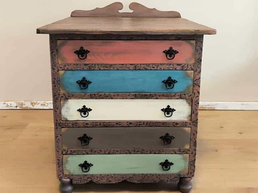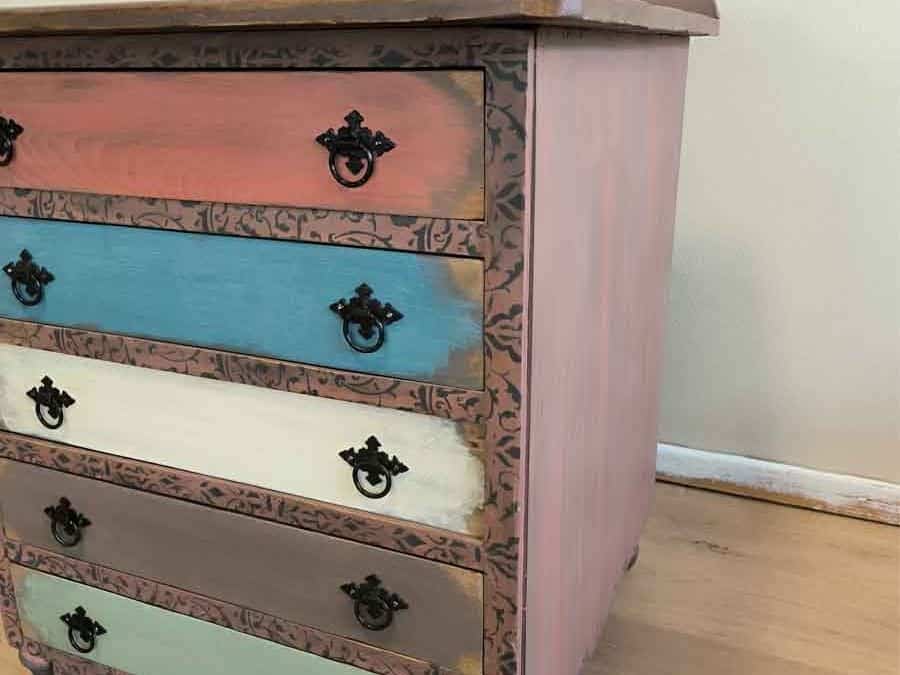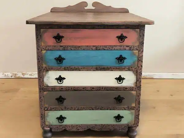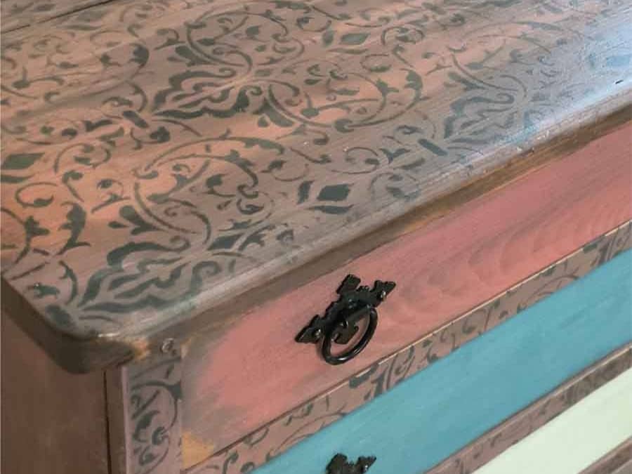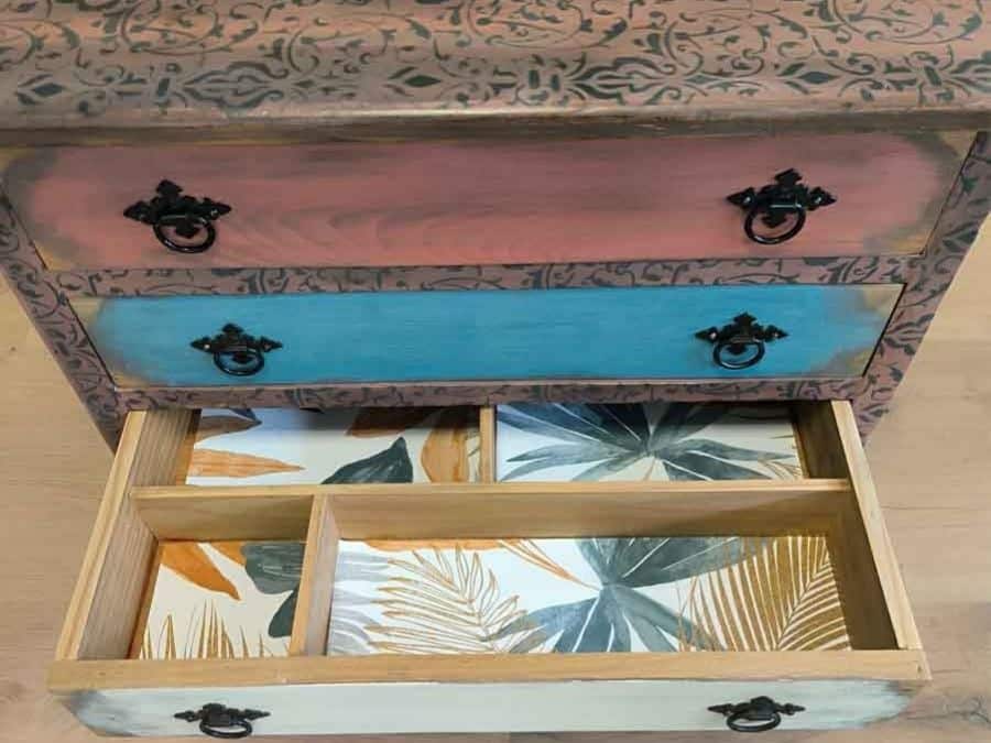 Los cinco cajones se han decorado de forma individual para otorgar dinamismo y carácter a la pieza, utilizando diferentes colores y patrones que realzan su estilo artesanal. Cada cajón conserva detalles únicos que muestran el trabajo manual realizado en el estudio: decapados, combinaciones cromáticas equilibradas y pomos decorativos cuidadosamente seleccionados.