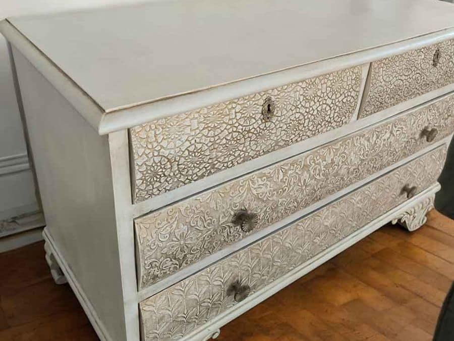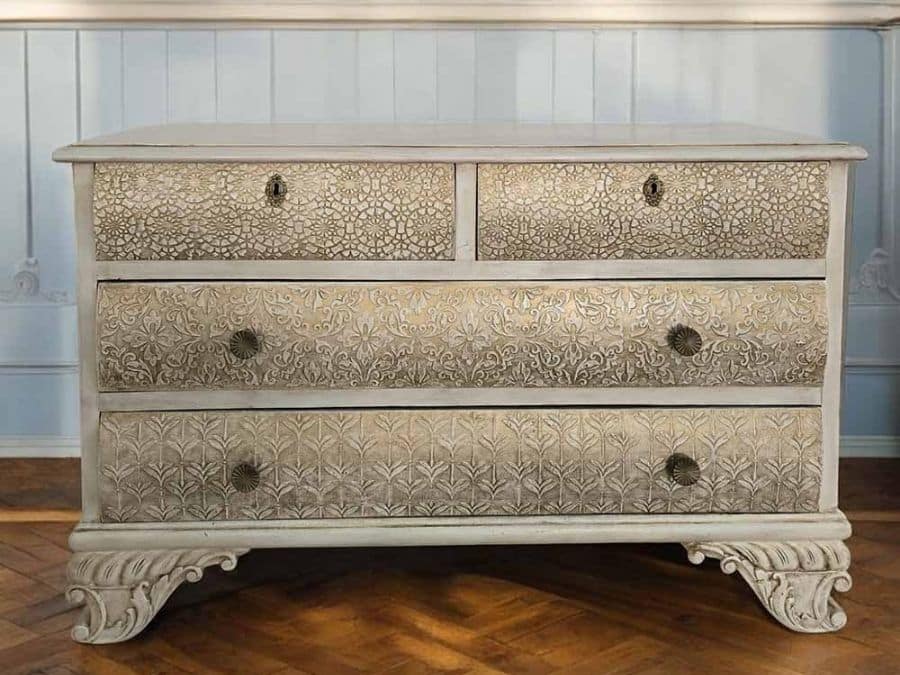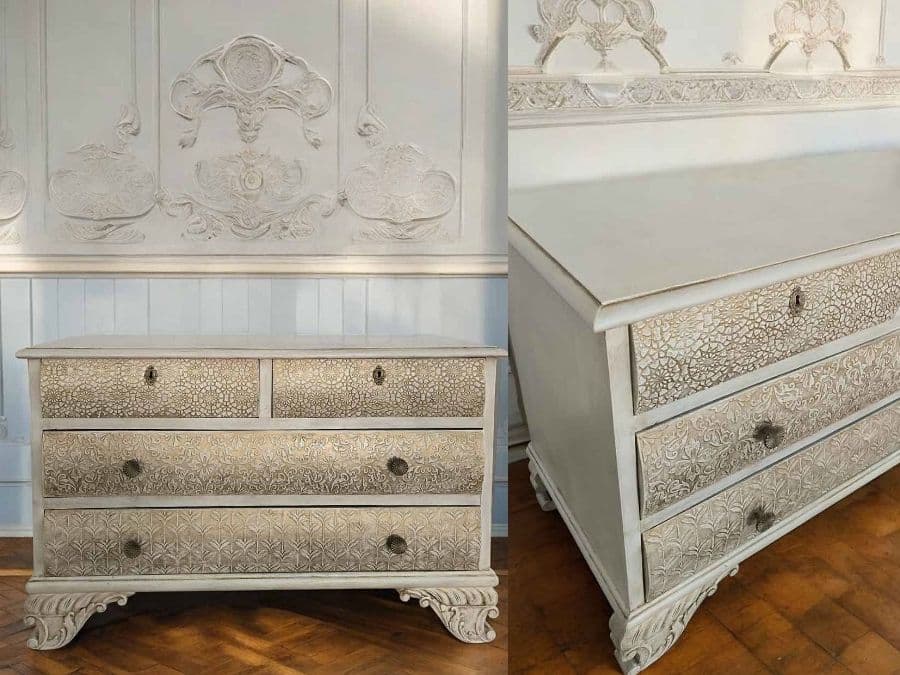 La cómoda presenta un trabajo decorativo de relieve en cada uno de sus cajones, con motivos florales y arabescos que aportan profundidad y un estilo vintage muy delicado.